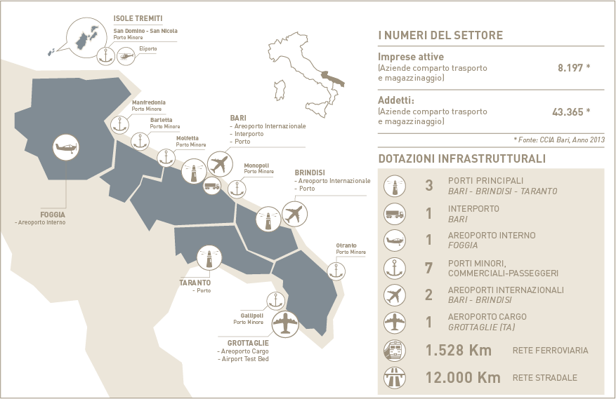 La chiave di lettura innovativa che la Regione vuole dare al comparto della logistica è l’integrazione di tutti i servizi, con la creazione di un vero sistema unico in grado di competere sul mercato internazionale. Il Distretto Logistico Pugliese Il Distretto Logistico Pugliese, aggregatore di imprese, centri di ricerca, università ed associazioni per lo sviluppo del settore, nasce con l’obiettivo di creare valore aggiunto per tutto il sistema logistico regionale e di promuovere e coordinare una progettualità strategica comune. Rafforzamento della competitività, innovazione e internazionalizzazione sono le principali linee di intervento che guidano i 5 macroprogetti del Programma di Sviluppo del Distretto. Inoltre la posizione strategica della Puglia garantisce al Distretto Logistico un ruolo di primo piano nei traffici del Mar Mediterraneo. Per informazioni sulle attività del Distretto Produttivo Logistico Pugliese: distrettologisticopugliese@assindustria.ta.it IL SISTEMA AEROPORTUALE L’aeroporto di Bari L’aeroporto internazionale Karol Wojtyla di Bari è, per volumi di traffico (3.593.200 passeggeri nel 2013), il principale scalo della Puglia. Il notevole impulso dato al potenziamento e alla qualificazione delle infrastrutture, gli eccellenti risultati conseguiti sul piano dell’accessibilità e dell’intermodalità con l’entrata in esercizio del passante ferroviario, hanno consentito all’aeroporto di Bari di divenire una delle più importanti realtà del sistema aeroportuale italiano, come dimostrato dall’inserimento dello stesso nel novero degli aeroporti strategici previsti dal Piano Nazionale degli aeroporti. L’ampio network dei collegamenti garantito dai principali vettori, anche low cost, fa sì che Bari e il bacino territoriale che gravita su di esso, siano stabilmente connessi con tutti i più importanti mercati continentali. L’aeroporto di Brindisi L’Aeroporto del Salento di Brindisi, il secondo scalo della regione per numero di passeggeri (1.989.496 nel 2013), rappresenta la porta di accesso a un territorio che comprende, oltre alla provincia di Brindisi, anche quelle di Lecce e Taranto. Nell’ambito dell’integrazione dei sistemi dei trasporti, l’Aeroporto del Salento rappresenta una realtà dalle grandi potenzialità avendo due strutture, aeroporto e porto, che di fatto costituiscono un’unica cosa. I dati degli ultimi anni evidenziano poi come l’Aeroporto del Salento registri una continua crescita per il traffico internazionale, sia di linea (+2%nel 2013) che charter (+12% nel 2013 rispetto all’anno precedente). L’aeroporto di Foggia L’aeroporto di Foggia si colloca al servizio di un bacino di traffico dal forte potenziale, specie nel settore turistico. L’aeroporto, già oggetto di interventi per l’ampliamento dell’aerostazione passeggeri, ospita attualmente i collegamenti elicotteristici verso le Isole Tremiti; il prolungamento dell’attuale pista di volo, in avanzata fase progettuale, potrà garantire l’operatività di aeromobili di maggiore capacità, più funzionali alle esigenze di un territorio a spiccata vocazione turistica. Aeroporto di Grottaglie A Grottaglie, a pochi chilometri da Taranto, l’Aeroporto “Marcello Arlotta” è uno dei più importanti scali italiani a vocazione cargo, fortemente legato al settore aerospaziale. L’aeroporto dispone di una pista che con i suoi 3200 metri è una delle più lunghe del nostro Paese. Ciò consente agli imponenti B747 LCF di operare sullo scalo pugliese per il trasporto negli Stati Uniti delle componenti del B787 Dreamliner realizzate negli stabilimenti pugliesi. Interporto L’Interporto Regionale della Puglia, situato strategicamente a meno di 5 km dal porto di Bari, dall’aeroporto internazionale Karol Wojtyla e dallo svincolo autostradale, è il sistema intermodale più importante della Puglia e uno dei più rilevanti del Sud Italia. Per la sua posizione strategica è attualmente l’unica struttura nel Mediterraneo orientale in grado di gestire i traffici da e verso l’area balcanica ed è inoltre un nodo logistico prioritario del Corridoio transeuropeo nº VIII Bari-Varna, nonchè delle principali vie di comunicazione da e per la Grecia e la Turchia.